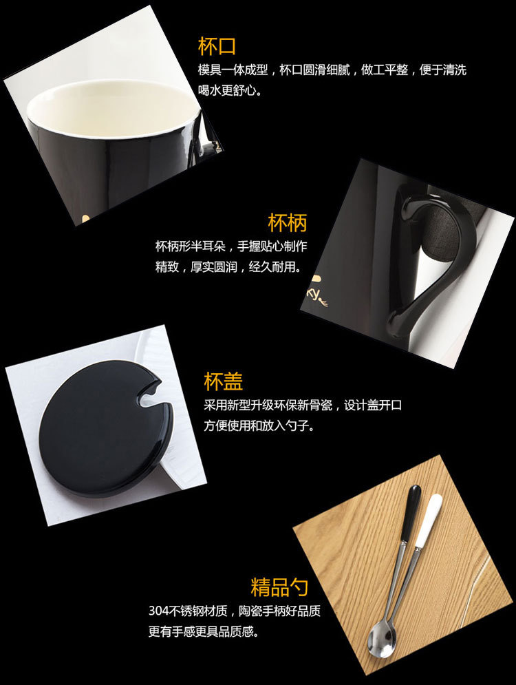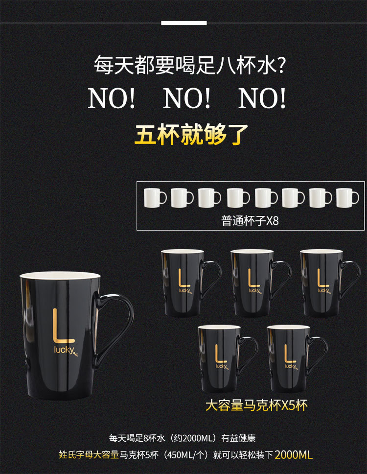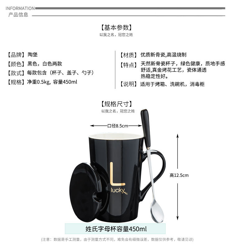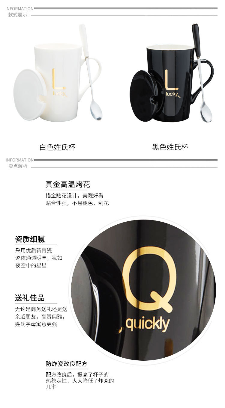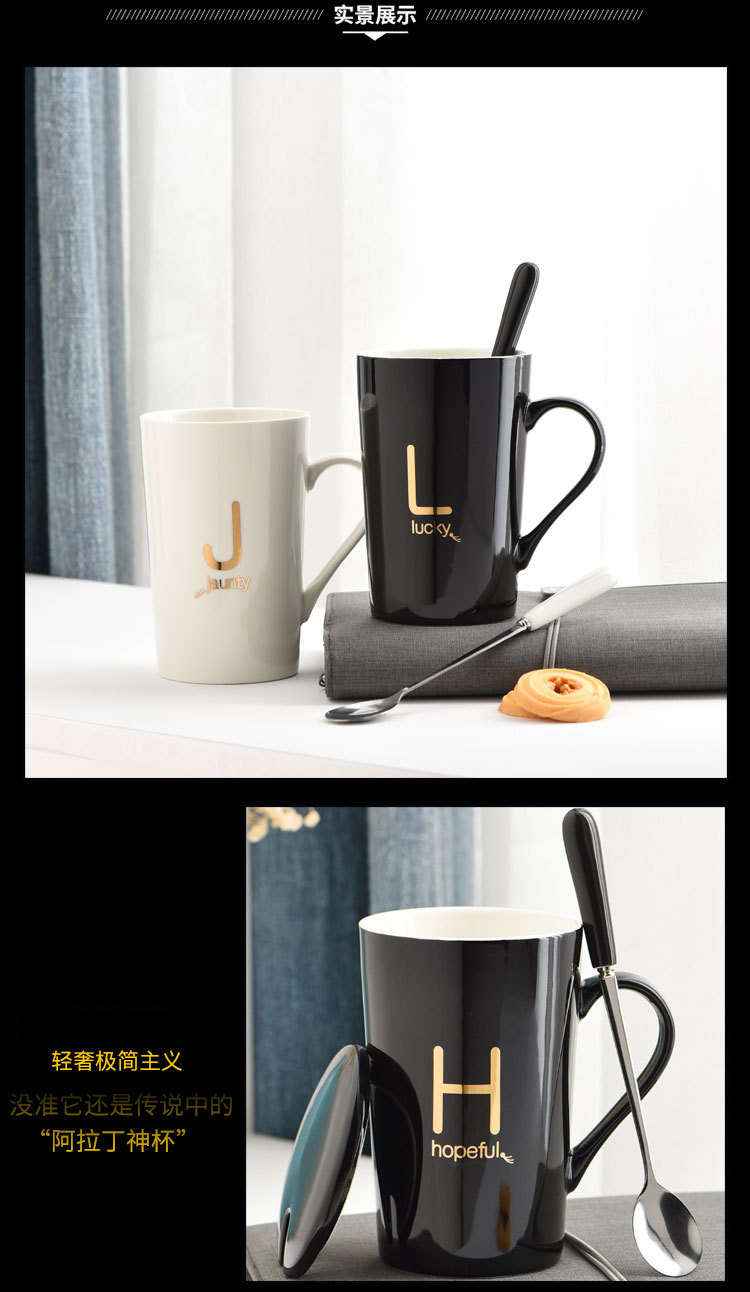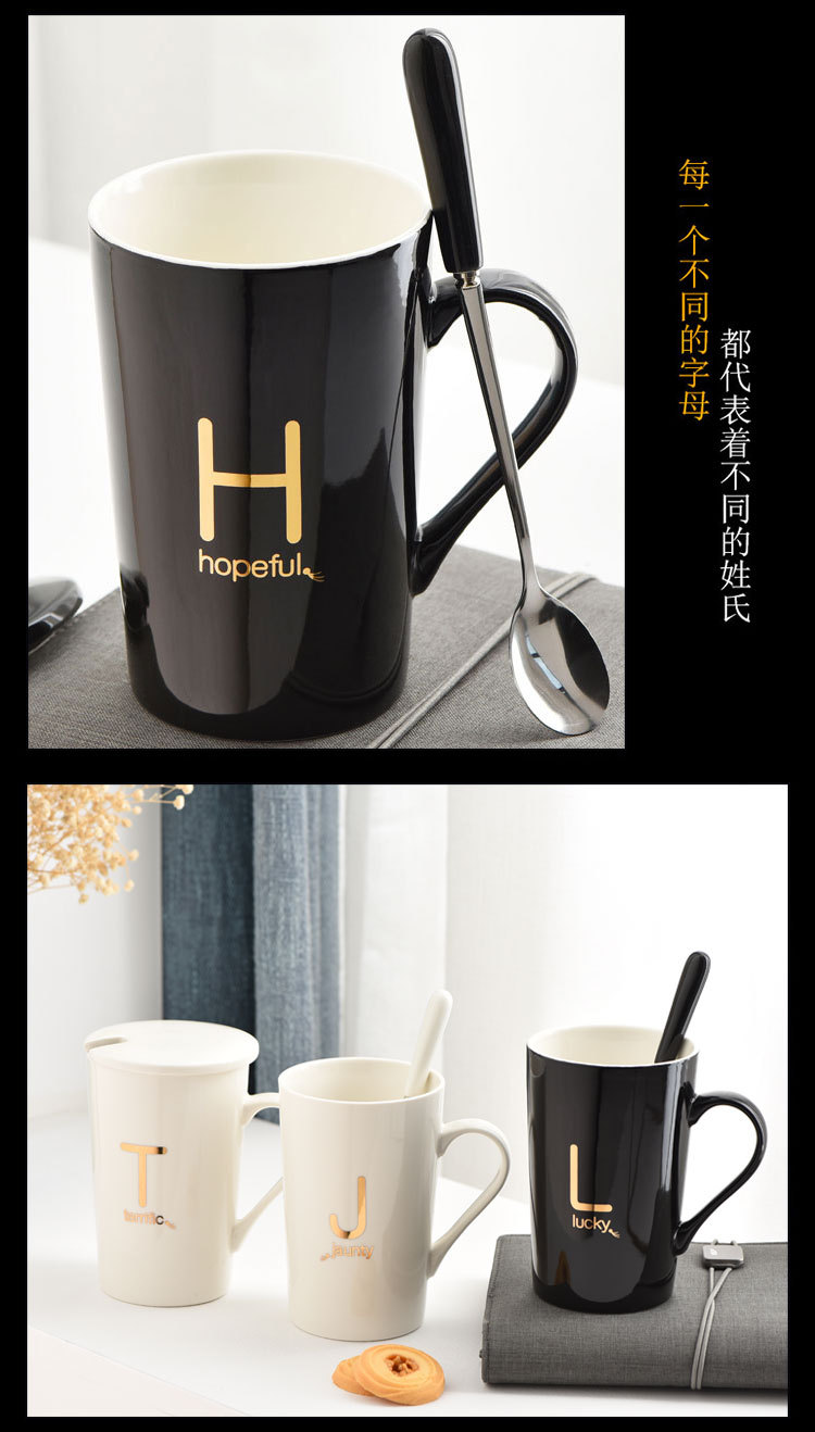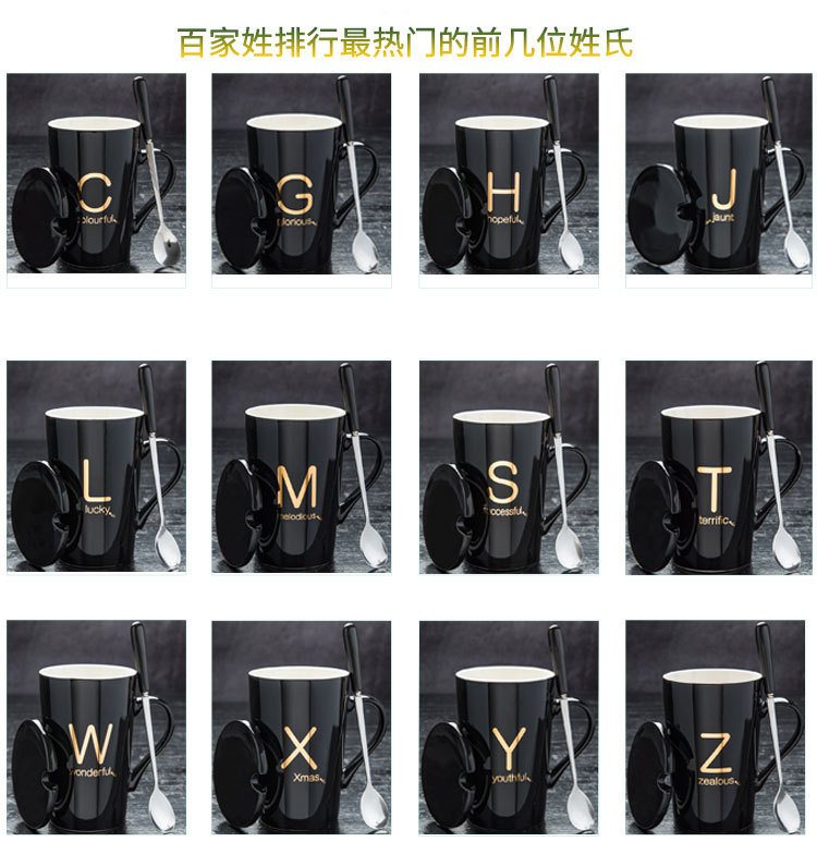 5. 创意姓氏字母陶瓷水杯马克杯子带盖勺情侣杯可定制logo咖啡
